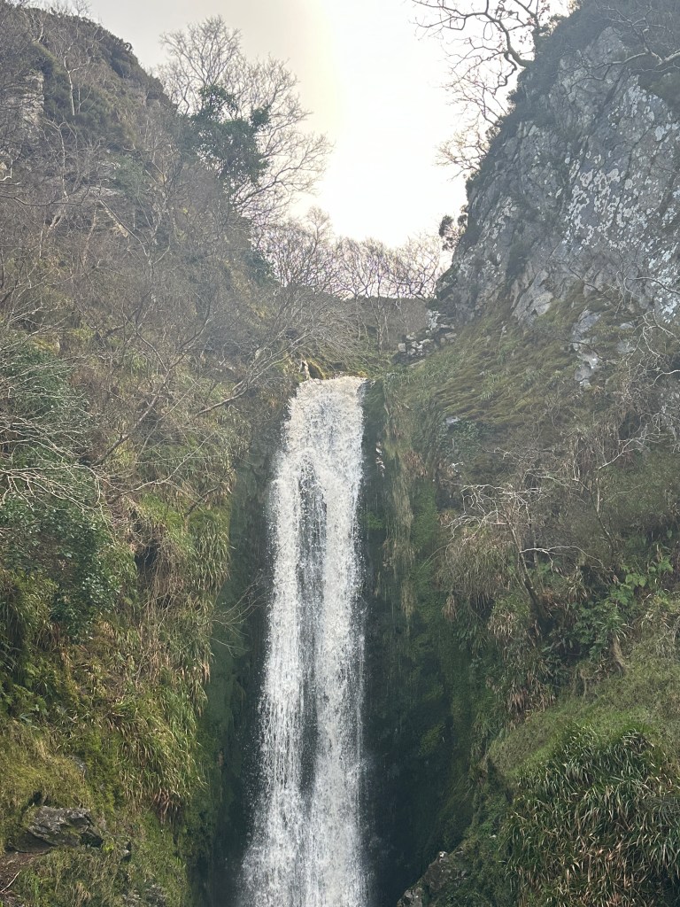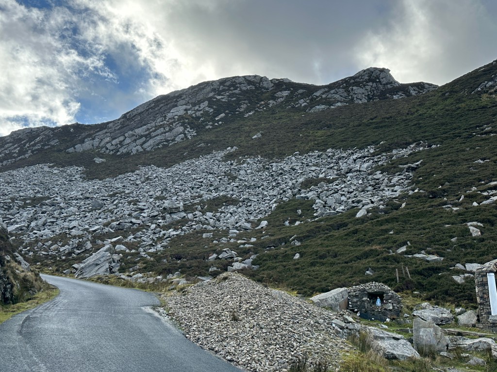 Today, we got really motivated. We hit St. Columba’s church ruins in Staid, Glenevin waterfall, and Mamore Gap. It’s amazing how close everything is here. When I was booking our Airbnb’s, I spread them out figuring on the nearness, that we could stay for a few days in one place and then head out on day trips over that time, then leapfrog over covered territory and repeat the process. It’s worked well but we have missed stuff. You can’t see everything. So today we visited the ruins of St. Columba’s Church in Staid (there are other St. Columba churches). I like ruins, architectures, the design of structures. All the churches here have graveyards on the grounds, this one had all large flat stone markers. I felt the need to walk around the markers. The newer churches have more recent above ground markers surrounding them. I’ll try to remember to get a picture. Just up the road was the Glenevin Waterfall. This was my favorite on the day. A nice walk up with faerie houses and bird houses (no pictures) and a gnome house (also no picture). I asked Liz after we’d seen a few of the faerie houses what she thought they were. She confidently said that they were faerie houses (my spelling because….Ireland). We walked a while further and saw a larger house. I said that’s a lot bigger. She said it’s where a gnome lives. Then she paused and looked over at me and in all seriousness said “They live together in peace.”. How great is that?