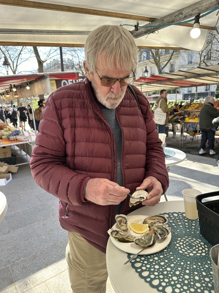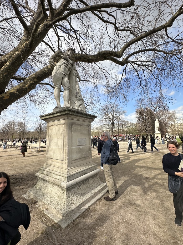 The next day was rainy as we set out to find open air markets. We found two. Paris has a lot of them. They’re the best. The tomatoes look a lot better here than at HEB and the fish selection is a lot better, too. Plus, I got to eat some fresh oysters while shopping. We had fun. Then we wandered down to and then along the Seine River. Past Notre Dame. It’s still undergoing restoration, but is supposed to be reopened by the end of the year. The following, and last in Paris, day we planned to go to Sainte-Chapelle to see the stained glass windows. After taking the metro and strolling along the Seine again, we arrived. Liz saw the line, paused, and said, “Let’s rethink this…”. So we tossed the plan and commenced wandering again. We’re very accomplished at it, wandering. We’re thinking about pursuing it competitively. Along the way we passed the Louvre and stopped at the Jardin des Tuileries for a lunch snack and to enjoy the weather.